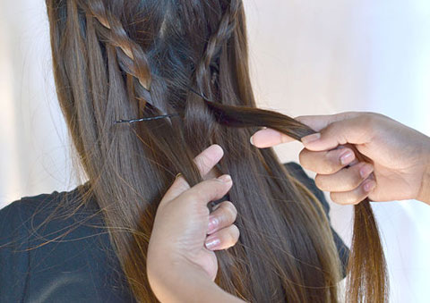 9. Tết thêm một lọn tóc hình thác nước phía bên kia đầu. Lọn tóc bên kia sau khi được tết đến gáy, bạn lại tiếp tục dùng cặp tăm để ghim lại.